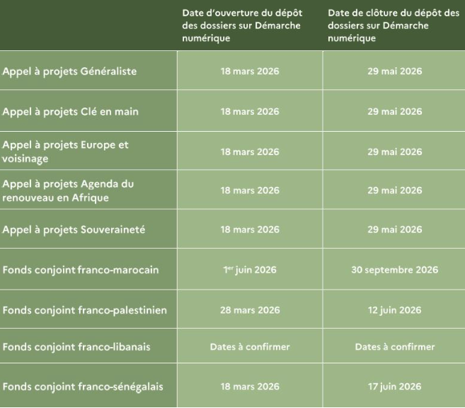 Le calendrier, les règlements ainsi que les informations sur la procédure de dépôt des dossiers sont disponibles sur le site de France diplomatie : https://www.diplomatie.gouv.fr/fr/politique-etrangere-de-la-france/action-exterieure-des-collectivites-territoriales/appels-a-projets-2026/