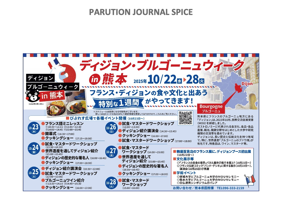 Dijon Métropole et le Département de Kumamoto coopèrent depuis octobre 2023 (Accueil de la première Semaine du Japon / Kumamoto à Dijon) et ont décidé de mieux faire connaitre Dijon aux habitants de Kumamoto, dans le cadre d’une opération de promotion territoriale intitulée « Semaine Dijon Bourgogne », organisée du 22 au 29 octobre 2025.